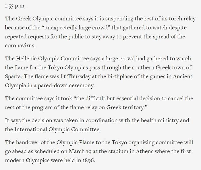 据外电消息,出于对公众健康的考虑,希腊奥委会宣布终止2020年东京奥运圣火在该国境内的传递。东京奥运火炬于昨日点燃,原本将在希腊传递一周,但今天传递至斯巴达时,引发大量群众围观。经与健康部门及国际奥委会协商,希腊奥委会决定取消希腊境内剩余火炬传递计划。19日,奥运圣火将在雅典交接至东京奥委会手中,并于20日抵达日本。
