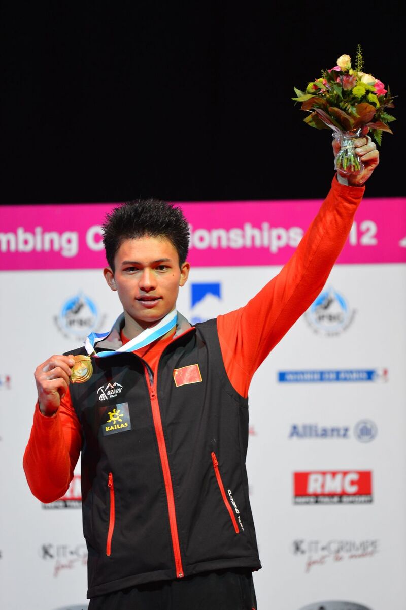 2012年9月16日,中国选手钟齐鑫在领奖台上。当日,在巴黎举行的世界攀岩锦标赛男子速度赛决赛中,钟齐鑫夺得冠军。新华社发