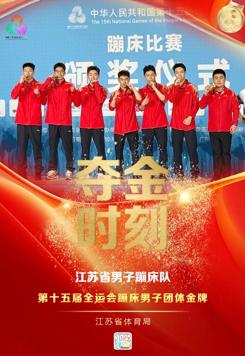 2025年10月11日下午,第十五届全运会蹦床项目男子团体决赛在广州体育馆举行,江苏队以182.24的总分获得冠军,这是江苏代表团参加本届全运会竞技比赛获得的第二枚金牌。