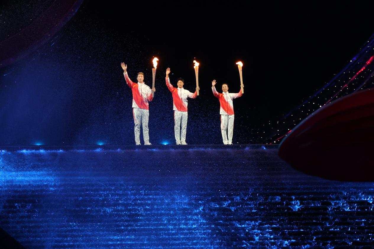 在激动人心的火炬传递环节,第一棒火炬手由曾获得跳水项目5个奥运冠军、21个世界冠军的陈若琳和乒乓名将马琳一同担任。作为江苏南通人,陈若琳16岁首次出征奥运便斩获两枚金牌,如今从运动员转为职业教练,为中国跳水事业培育出更多杰出人才。随后,香港传奇自行车运动员黄金宝与香港滑浪风帆运动员方文浩、“跳水女皇”郭晶晶与网球运动员王欣瑜、花样游泳运动员双胞胎姐妹王柳懿与王芊懿以及羽毛球男双运动员梁伟铿与中国跳绳运动推广大使赖宣治依次接力传递火炬。最终,粤港澳三地的代表火炬手苏炳添、张家朗和李祎共同点燃了主火炬,为这场盛会画上了圆满句号。