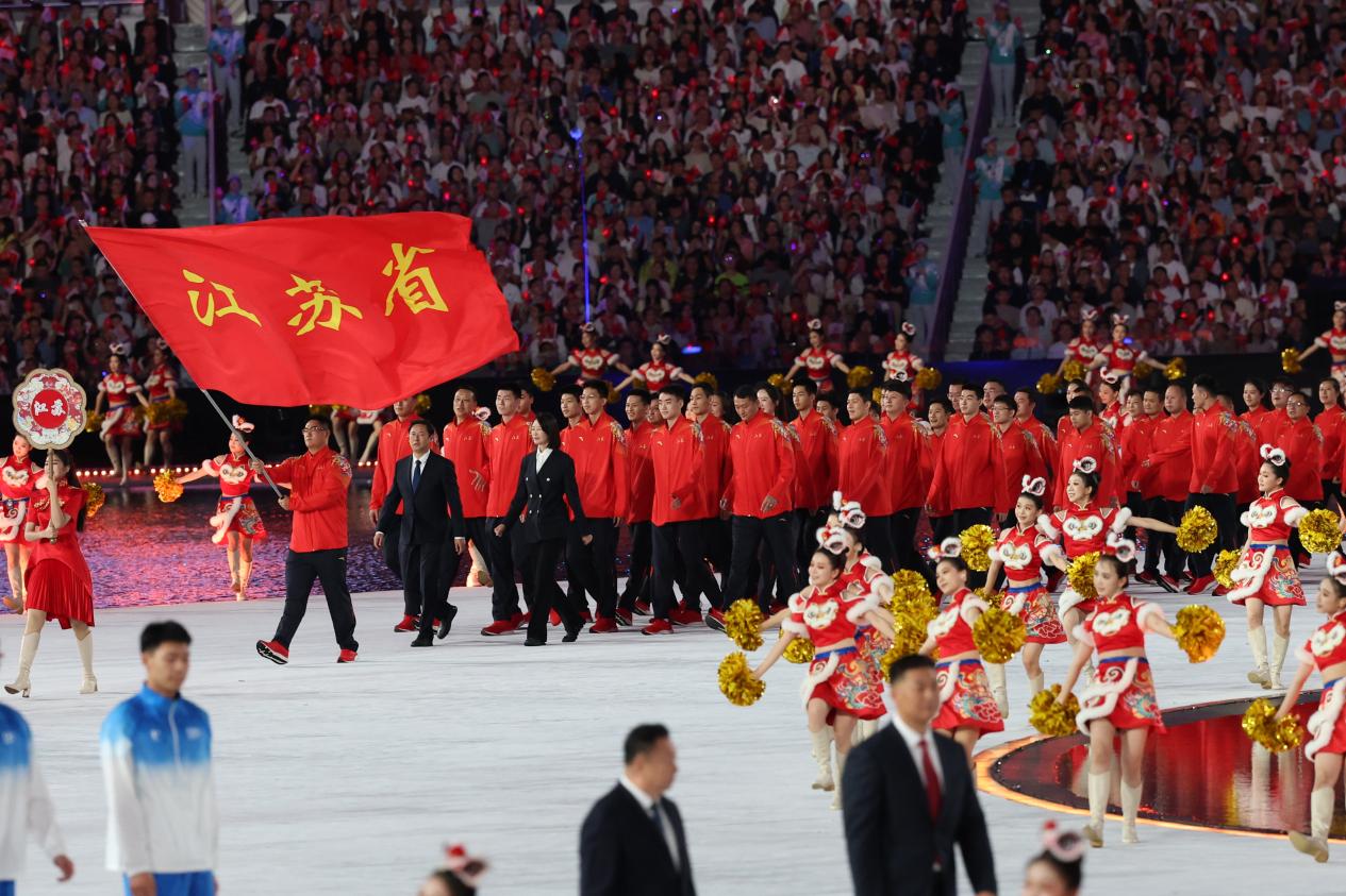 开幕式上,江苏省代表团第11个入场。来自跳水、排球、攀岩等项目的51名运动员、教练员和工作人员组成了参加十五届全运会开幕式入场仪式的江苏代表团方阵,旗手由亚运会冠军、田径运动员王琦担任。