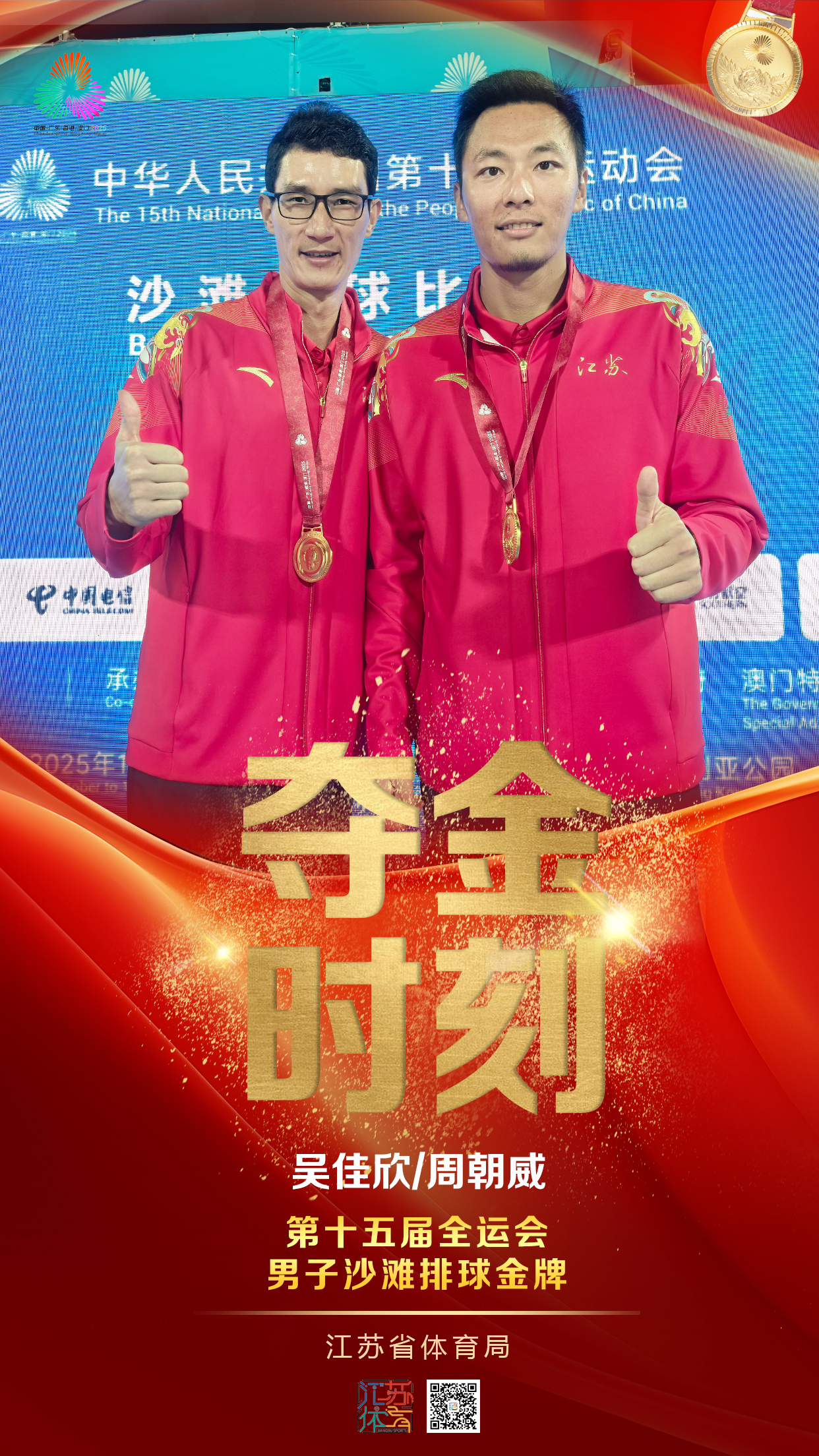新华日报·交汇点讯 11月10日,第十五届全运会男子沙滩排球比赛在香港维多利亚公园落下帷幕。江苏队吴佳欣/周朝威组合表现优异,成功将该项目金牌收入囊中,实现江苏男子沙滩排球全运会金牌零的突破。