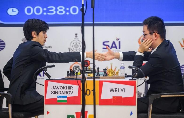 首盘15分钟快棋赛,辛达洛夫执白,开局后很快进入均势的车象兵残局,之后又进入象兵残局,最终转入王兵残局后,形成重复局面,于第45回合握手言和。换先再战,韦奕以王兵起步,双方进行了非常激烈的攻防较量。进入后半盘,韦奕在成功打开王翼线路后,一度形势非常主动。可惜在时钟的催促下,韦奕错过了最佳的续着,被辛达洛夫反击得手,最终于第60回合遗憾落败。