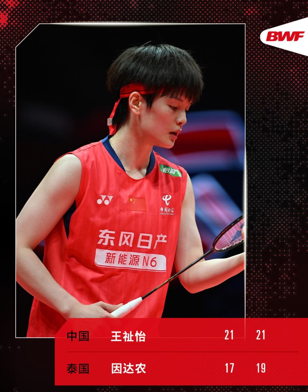女单B组,卫冕冠军王祉怡直落两局战胜泰国老将因达农,提前锁定半决赛资格。同组的泰国选手李美妙退赛,同为0胜1负的因达农和中国队韩悦将于19日交手,争夺另一个出线资格。