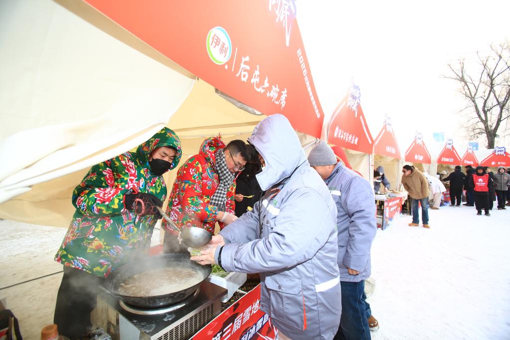 这是雪地足球“村超”联赛启动仪式现场,场上激战正酣,场边同样人气沸腾。烙饼刚出锅,铁锅炖咕嘟冒泡,冷了便钻进暖棚上炕,不冷就坐上400米长的雪滑梯,享受“速度与激情”。