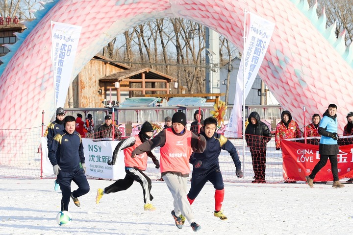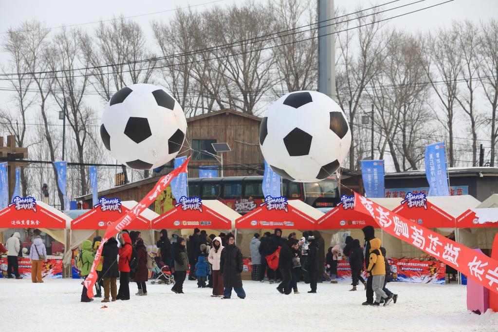 雪花覆垄,“稻梦空间”变身足球乐园。沈阳市沈北新区兴隆台街道稻梦小镇里,第三届雪地足球“村超”联赛正踢得热气腾腾。