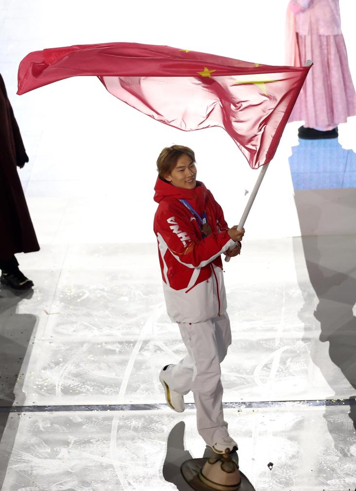 2月22日,中国体育代表团旗手苏翊鸣在闭幕式上入场。新华社记者 李京 摄