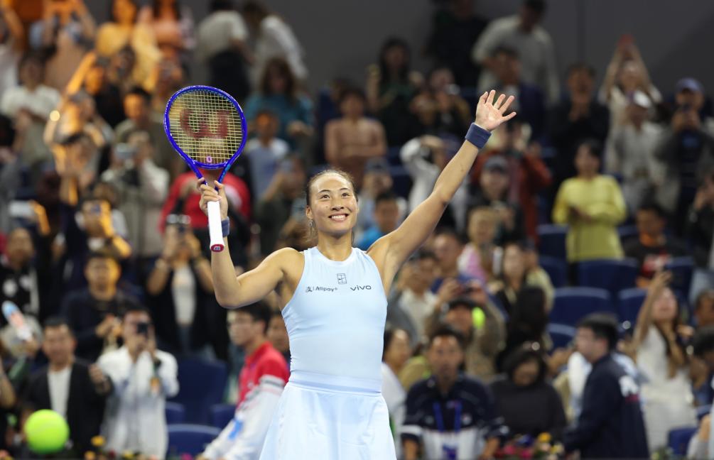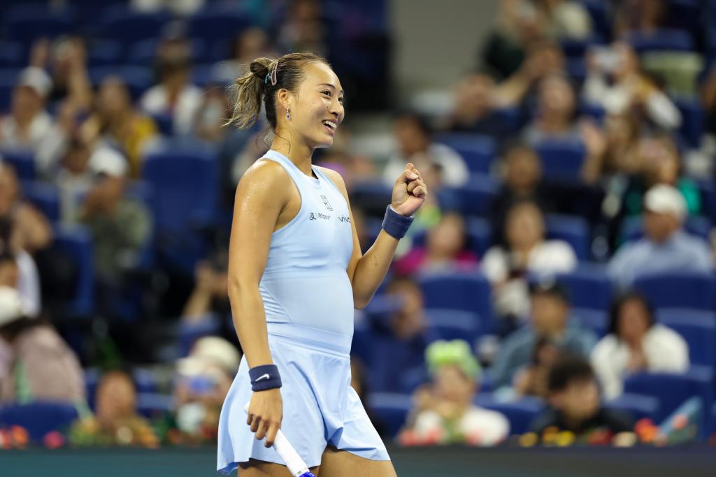 9月27日,郑钦文在比赛获胜后庆祝。新华社记者 白雪飞 摄