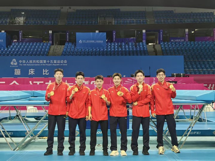 10月11日下午,第十五届全运会蹦床项目男子团体决赛在广州体育馆举行,江苏队以182.24的总分获得冠军,夺得江苏体育代表团在第十五届全运会上的第二枚金牌。