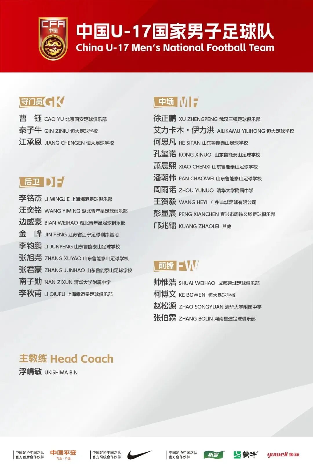 为全力冲击2026年U17亚洲杯决赛阶段,中国U-17男足国家队计划于2026年1月21日至2月12日在广东省深圳市开展集训,主教练浮嶋敏挂帅。本次集训中,来自江苏的后卫金峰和中场彭显宸成功入选。