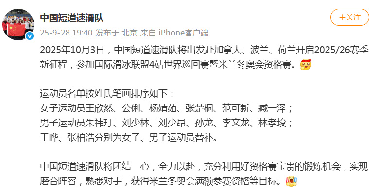 新华社北京9月28日电(记者丁文娴、刘阳)2025-2026赛季国际滑联短道速滑世界巡回赛暨米兰冬奥会资格赛即将开启,中国短道速滑队28日公布参赛队员名单。