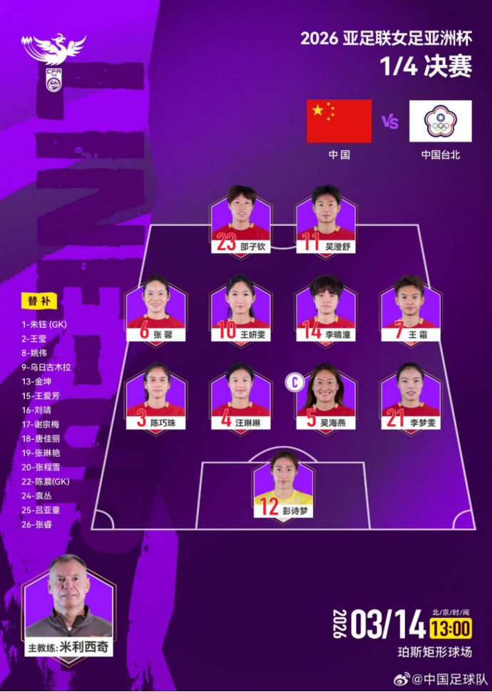 3月14日,在2026年亚足联女足亚洲杯1/4决赛的争夺中,卫冕冠军中国女足2:0战胜中国台北女足,晋级半决赛的同时,获得了2027年女足世界杯的入场券。