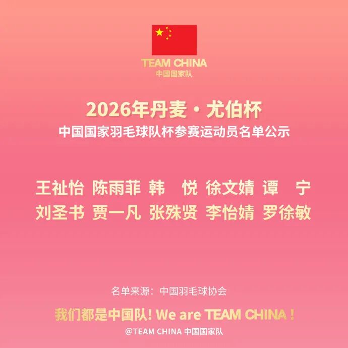 其中,2025年世锦赛亚军陈柏阳/刘毅首次入选汤姆斯杯阵容;2024年世青赛女单冠军,2007年出生的小将徐文婧首次入选尤伯杯阵容。