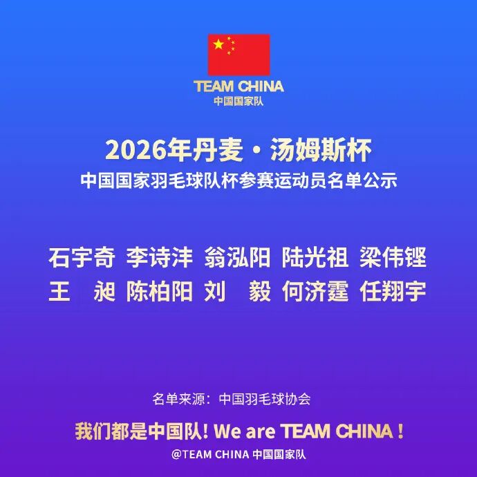 2026世界羽联汤姆斯杯和尤伯杯决赛将于当地时间4月24日至5月3日在丹麦霍森斯举行。根据中国羽毛球协会公布的参赛名单,来自江苏的运动员石宇奇、陆光祖、陈柏阳、徐文婧将随队出战。