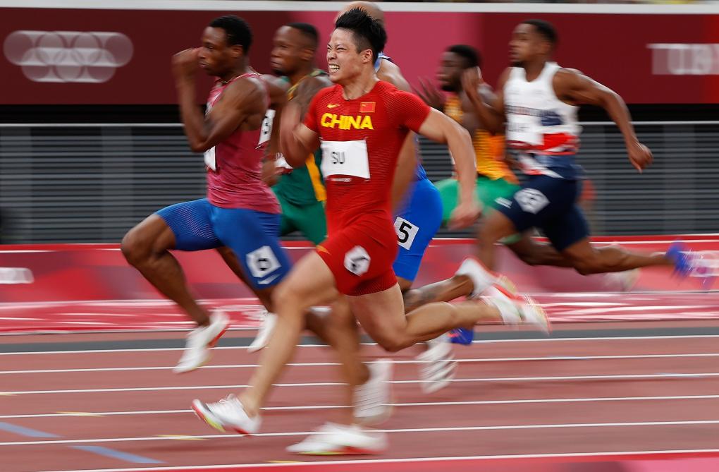 2021年8月1日,在东京奥运会田径男子100米半决赛中,中国选手苏炳添跑出了9秒83的成绩。新华社记者 王丽莉 摄