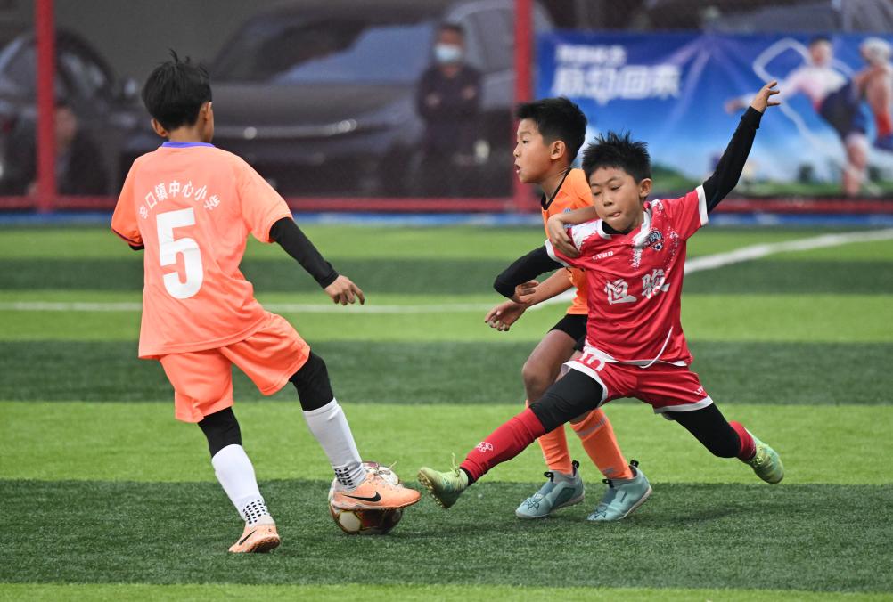 在天津市足协青训基地,天津市足协青训中心青少年球员进行对抗训练(资料图)。新华社记者 孙凡越 摄