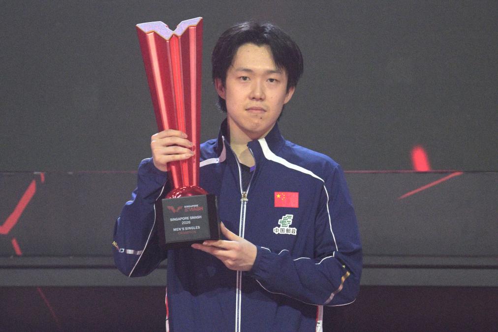 3月1日,王楚钦在颁奖典礼上举起奖杯。新华社发(邓智炜摄)