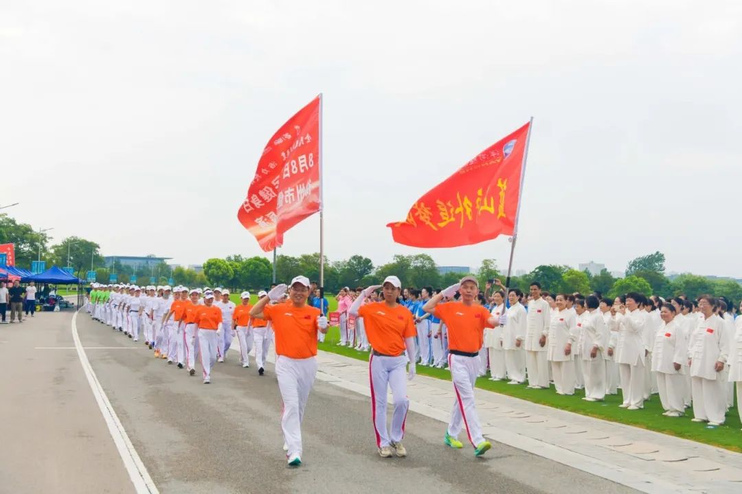 随后,集体展演环节将活动推向了高潮。联合徐州市老年体协、徐州市健身气功协会等各类体育协会的1000余名展演人员,为现场观众带来了一场精彩纷呈的视听盛宴。传统项目健身气功八段锦展演中,535人整齐划一的动作,如行云流水般舒展流畅,将中华传统健身文化的魅力展现得淋漓尽致;24式太极拳表演,一招一式刚柔并济,尽显太极的沉稳与内敛。创新项目健身艾锤操表演,以其独特的创意和活力,吸引了众人的目光;柔力球精选项目表演,选手们手中的柔力球如灵动的精灵,在球拍间飞舞,展现出高超的技巧。此外,军鼓队分列式表演气势磅礴、广场舞蹈“舞动中国”活力四射、太极功夫扇刚劲有力、舞龙队“中国龙舞起来”威风凛凛、小绳健身操表演青春洋溢、舞蹈“母亲是中华”深情动人、五禽戏展演生动有趣、大舞表演韵味十足,每一个节目都赢得了现场观众的阵阵掌声和喝彩声。